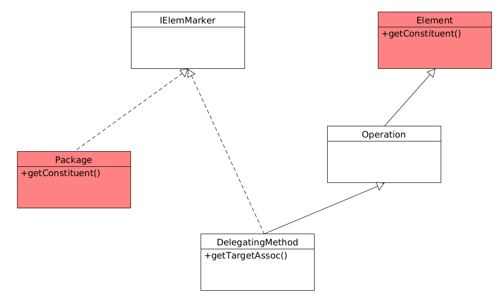 This is a concrete example where the problem I've mentioned previously can appear. Ideally, we would like to detect a feature for the method getConstituent() that groups together Package and Element. However, because of the getTargetAssoc() method, there will be a concept grouping together IElemMarker and Element with both methods. This concept is more specialised than the first concept (because there are more attributes), and there will be as many occurrences of the 'duplication' in both concepts, so the algorithm will delete the first concept, because it is considered less 'interesting' (i.e., it can be compared to the other concept, has less methods but contains the same number of non-minimal classes, as defined by Mili et al [1]).