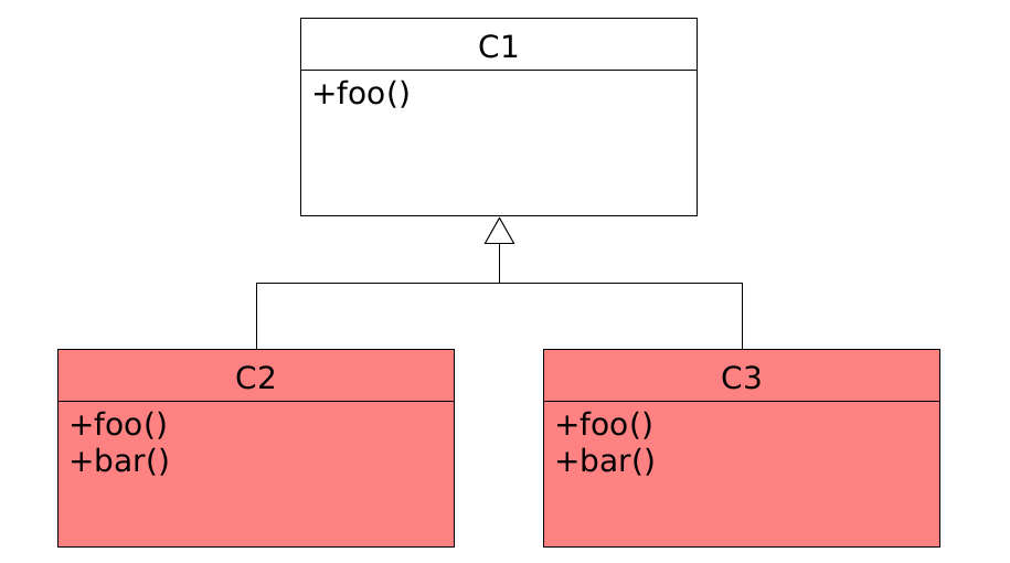 This one is more artificial, and shows a concept grouping C2, C3 with foo() and bar(). Here, foo() is not duplicated in an ad-hoc manner, without encountering the "one method, many paths" problem. Unfortunately, we don't have a way to differentiate foo() from bar() using only the given lattice.