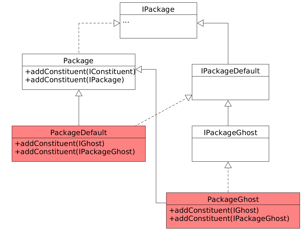 Let's add a method into PackageDefault, ideally a method that is not found anywhere else. Because of the "one method, many paths" problem, a new, supposedly more 'interesting' concept, grouping Package and IPackageDefault, will replace our original concept. Now, when looking at this feature, it seems a bit less natural to move the duplicated methods into Package, at least for me, my first intuition would be to look at some common ancestor between Package and IPackageDefault, not to mention the fact that we have a false positive to take care of.