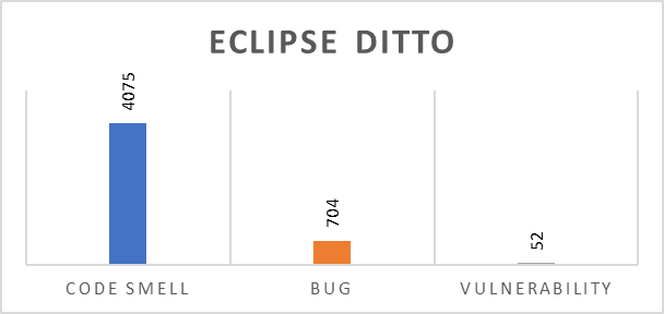 The above figure shows the generic information about the code quality of Eclipse Ditto framework after successfully analysing the codebase. The issues indeitfy by the SonarQube were saved with their rule, message, type, severity, line and effort. We identified total 4832 code issues in which 704 are bugs, 4075 are code smells and 52 are vulnerabilities shown in the figure below.