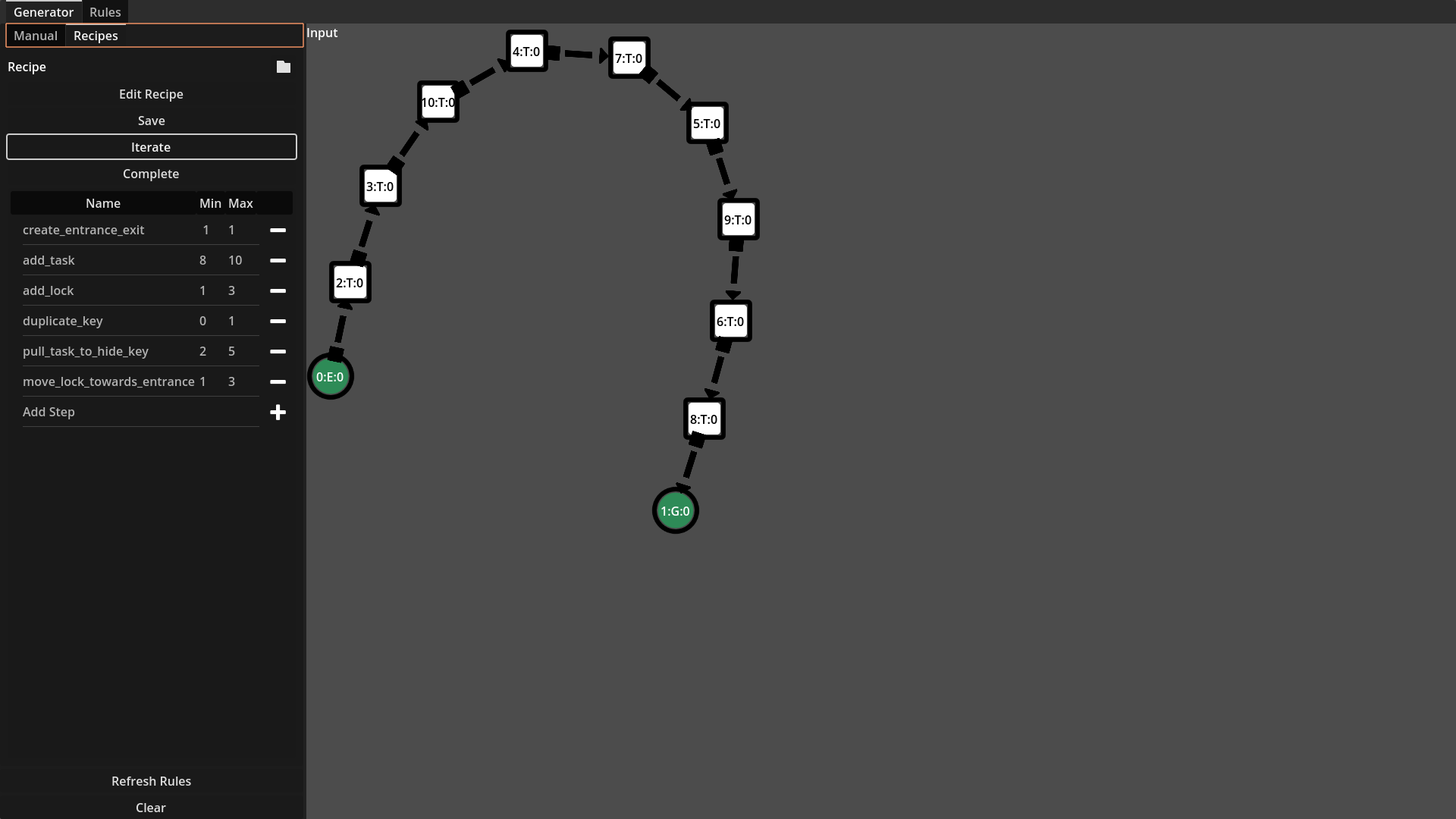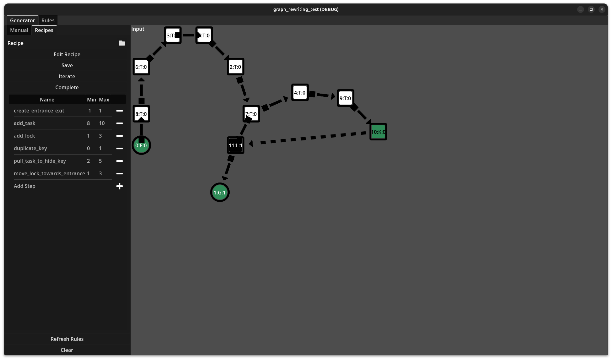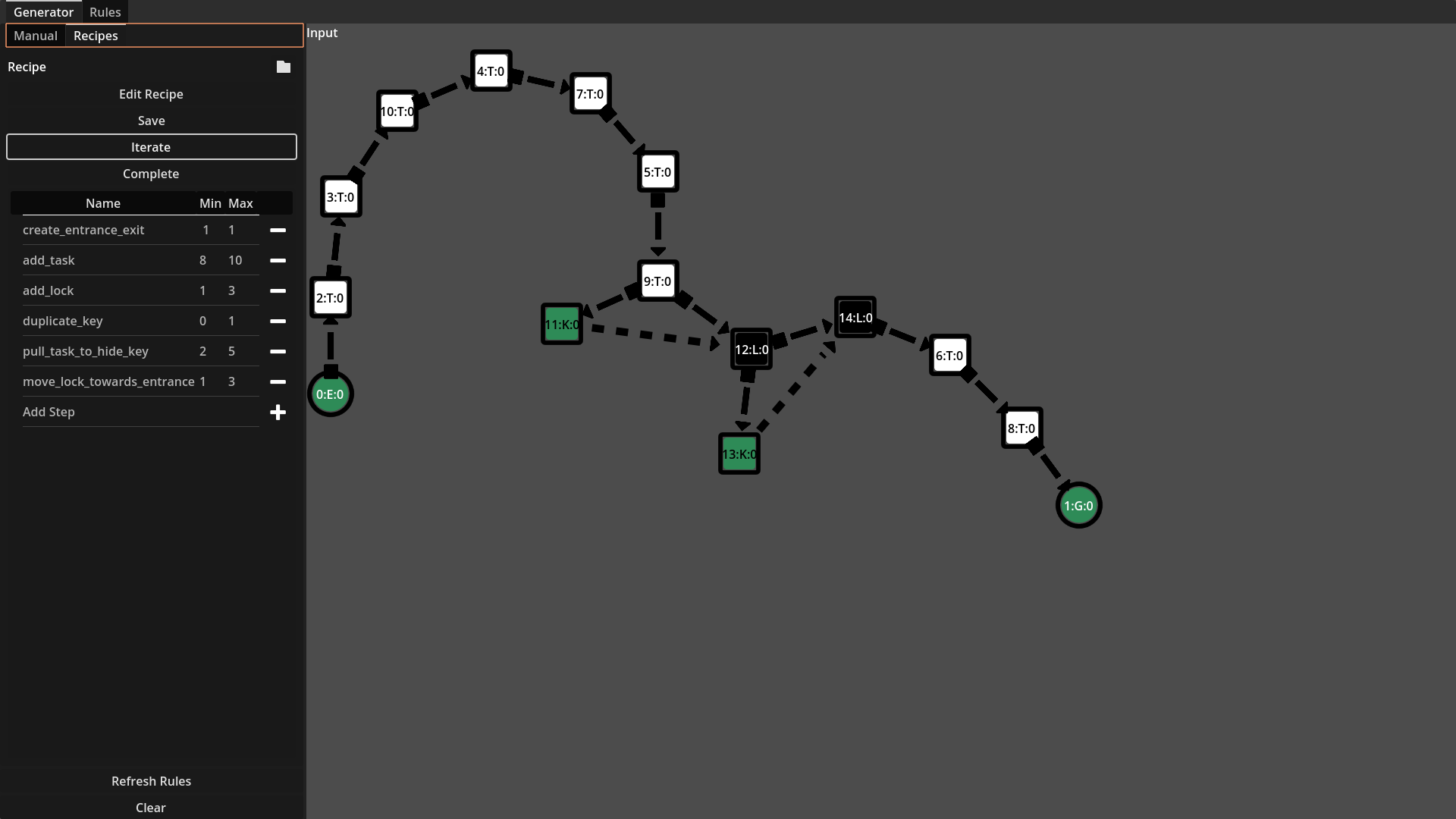 - Creating Complexity: These rules transform a simple starting point into a complex, non-linear mission graph. Rules can be used to add tasks, introduce lock-and-key dependencies, create branching paths, or hide keys further from the main route.