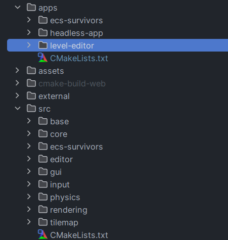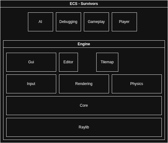 Next, I thought it would be a good idea to build separate apps, using the same new modules I refactored. So I have a base Application class, with an init() and run() function. This clas,s however, does not depend of Raylib, so it can be instead used as a headless application for something like a web server if I eventually want to make some networking features. I also have a GraphicalApplication class, which is essentially the same but includes Raylib for the windowing. From these, I was able to create ECS-Survivors, the original game, an Editor for ECS-Survivors, and finally, a basic headless app, just for the proof of concept really.
