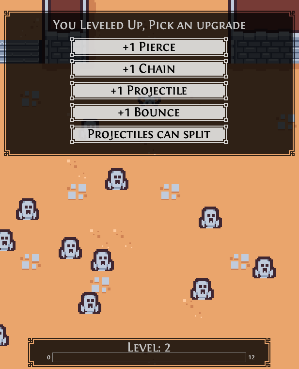 We're making a game, of course, we need some kind of progression mechanic. What's typical for survivors-like games is that after you have gained enough experience through picking up somekind of experience resource, or just through eliminating an enemy, you get to pick from three random power-ups. I decided that we would only need to slay enemies to gain experience, and for now, at least, the player would have fixed choices when they level up. This will likely change once there are more abilities and ways to enhance them. It's really just that simple, I get to use the GUI framework I built and voila! We have player progression in our game.