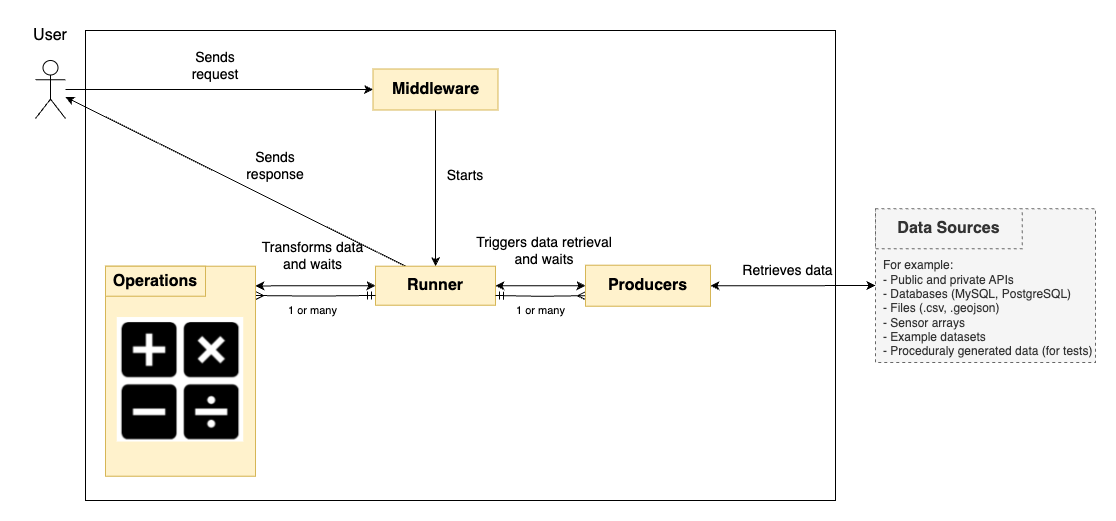 Runners orchestrate everything by implementing the Observer and Publisher/Subscriber patterns under the hood. To process a query, a Runner invokes the relevant Producers, executes one or more Operations on their outputs, and returns the result to the consumer.