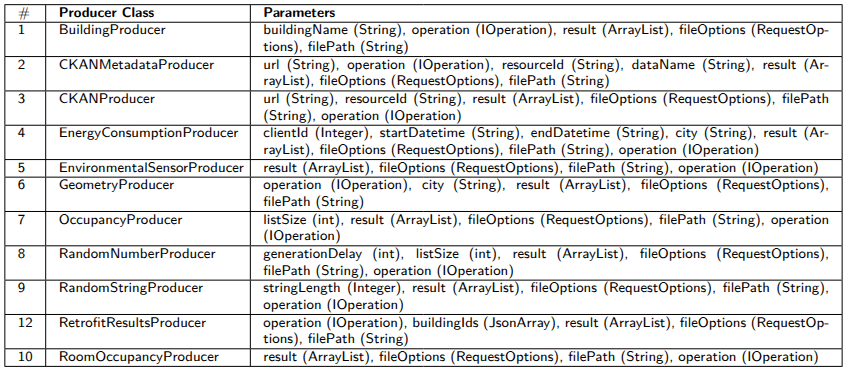 Producers connect to data sources and fetch data. Each producer is designed in such a way that it knows how to talk to a specific source of data- a PostgreSQL database, a MongoDB collection, a CKAN open portal, a CSV file server, or a live sensor API. When writing a query, a user should specify which producer to use and pass the right parameters, what we show in the example Section.