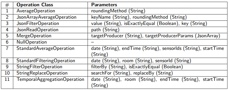 Operations describe transformations to apply to Producer outputs, such as filtering rows by time window, or counting occurrences where a sensor value meets specific conditions. Operations can be chained to build a full processing pipeline within a single query.