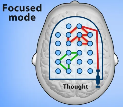 Let’s get back to our Pinball Game example. In the Focused mode, the bumpers are placed close together, guiding the ball along familiar neural pathways. These pathways allow for efficient thinking and problem-solving when working on tasks you already understand, such as basic arithmetic or familiar concepts in a well-known subject. The ball moves smoothly along well-paved roads, representing established neural patterns.